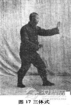 收式时,走到原起点处,惟要右式。左手左足在前停住,回身手足起落,与右式相同,头顶塌腰之劲也然。收时左足极力进步,与前无异,惟右足紧跟在后,亦如劈拳收式跟步相同,稳住片时休息如前(图19)