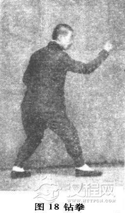 起点时,两手攥拳,先将前足如劈拳式,往前垫步,远近亦相同。前手心朝下,后手心朝上,出手时左手往回,拉至心口下脐上,拇指里根紧靠腹,右手出时,于左手背上出去,钻出手高不过眉,手心仍朝里对眼,手离眼尺余停住。右足进步,亦同时与右手齐去极力前进,两足相离远近,亦与劈拳步相同,手足起落仍要齐。两肩两胯抽劲,仍与前三体式同,腰塌劲亦然,惟眼上翻看拳手心(图17、图18)。