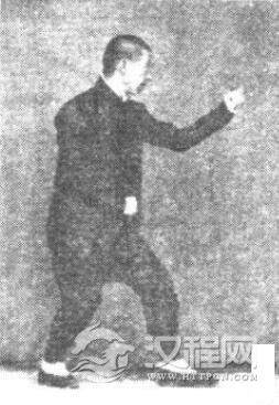 再起,右拳手腕往外扭劲,手心朝下。左手腕往里扭劲,手心朝上。右足垫步,两手两足起落进步,仍与左式相同,勿差分毫。手数多寡,仍看地形远近自便。然无论远近,亦总出去左手再回身(图19)