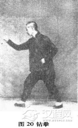 回式时,左足勾回(逢足往里勾,足后根极力往外扭劲为要),左手同时将拳扣回至口处,手心朝下,手腕往外扭劲停住,右拳手腕往里扭劲,扭至手心朝上。如劈拳钻出,两手仍如前法起落,右足同时与右手齐起齐落,仍如左右阴阳相摩之形式(图20)