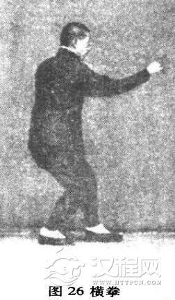 起点时,两手一齐攥拳,左拳手心朝上,右拳手心朝下。出手时将右手背往左肘下,出去向左手背,此时左手停住劲,不可移动,俟出左足时,右手与左足相错综着斜出,右足随后跟步在后。两足相离远近,如炮拳跟步相同。进步时右手拧住劲,手腕向里翻,翻至手心朝上,连翻带拧,直往前钻到极处为度,不可有曲劲。左手腕向外拧劲,至手心朝下,手背向上,同时向后拉,至右肘停住。两手分开时,如同两手撕棉不开之意。两肩均合住抽劲,如同扣胸之状,暗含着抽,可莫显露着抽。心不可使努力,要自然为妙。此时两眼看右手心,两胳膊如同太极单阴阳鱼形,前手高低与前胸平(图25、图26)。