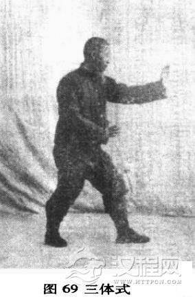 前进,两手仍勿动。右肘靠着胁,左手极力推住劲,再将左足极力前进落地,右足亦再极力前进步,未落地之时,左足提起,仍靠右足踝骨,如前式稳住。此式与虎扑子头步相同。惟两手之式,左手仍推着劲,右手仍在心口不动。前后两式,俱金鸡独立之式。