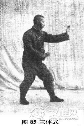 预备。起点三体式。左足先往前垫步,次将右手心向上,往左胁下靠着身子极力穿去,右肩如同穿在左胳膊下窝一般,又次将左手屈回在右肩上,手心向肩尖,如同扣住一般,身子阴阳相合着伏下去,小腹放在左大腿根上(图85、图86)。