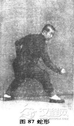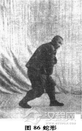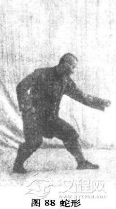 形意拳蛇形者,乃天地所赋之性,身体最玲珑,最活泼者也。身形有拨草之能,二蛇相斗,能泄露天之灵机,能曲能伸,能绕能蟠。在腹内即为肾中之阳,在易即为坎中之一也,在拳中谓之蛇形,能活动腰中之力,乃大易阴阳相摩之意也。又如易经方圆之中,震巽相接,十字当中求生活之谓也。其拳顺,则内中真阳透于外,如同九重天,玲珑相透,无有遮蔽,人之精神,如日月之光明矣。其拳谬,则阴气所拘,拙劲所捆,身体不能活泼,心窍亦不能通徼矣。学者于蛇形中勉力而行,久之自能有得,如蛇之精神,灵巧奥妙,言之不尽。