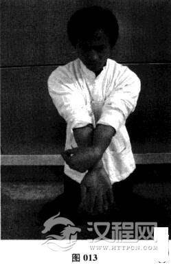 所谓沉肘归中定位法.指的是习练者以二字钳羊马姿势站定,双肩放松下沉后,双肘及两前臂于胸前相合放松下沉,在身体中心线上的心窝位置并住不动。同时将并住的双肘、双臂尽址向前伸展(图013)。为了方便练习,初学者可以在双肘之间夹上一支笔.来检验自身动作的规范性与持久性。