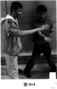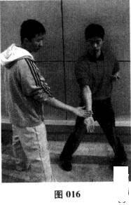 如扎马者在肘部归中定位不动且整体动作结构不散乱的情况下.能明显感受到自身前竹随配手下拍之力稍向下沉(图016),当配手下拍之力消失之际,下沉的前臂迅速自动弹回中线位置(图017);
