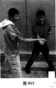 以二字钳羊马姿势站立,保持右肘归中定位的摊手形状(图014);令一配手右侧站立.抬起右掌以短促轻快的动作,向下方轻拍扎马者前伸之右前臂(图015).