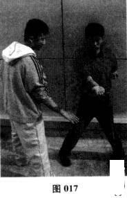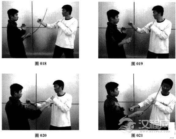 (1)甲方手持一段弹性较好的树枝或藤条,指向乙方头面部位;乙方出右拳攻向甲方头面,乙方右拳拳腕部分与树枝前端相接触(图018)