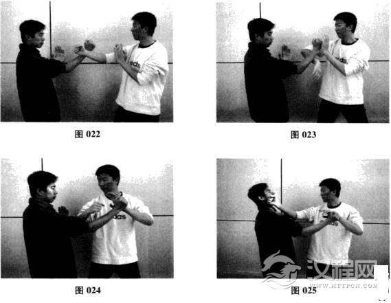 (1)甲方出右拳攻向乙方头面,乙方也出右拳攻甲方头面,双臂尺骨相交.两股力{止相抗衡(图022),