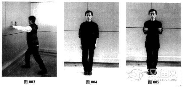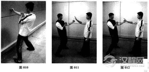其一,采用墙壁试力的方式。离墙约一步之遥.面对墙壁,以二字钳羊马姿势站立.保持右手口字冲拳的形状.使右拳面突起的骨节刚好抵住墙面;在保证二字钳羊马整体姿势不变形的情况下,以腰胯带动周身,通过拳头向墙面突然发力前冲。如能明确感受到.墙面回传的反作用力通过右拳、右肘、双肩、腰胯、双膝.回到脚底,则说明二字钳羊马的动作成型了(图010)。初学者在扎马无法确定是否达标的情况下.也可以用此种方式寻找整体发力的感觉.从而逐渐将扎马动作规范定型。