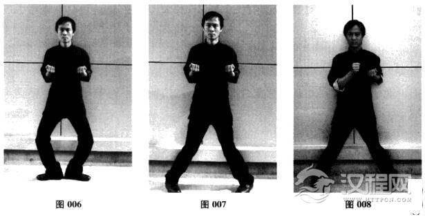 (4)双脚跟以双脚掌为轴.同时向两侧旋转分开,呈八字形(图007);站定后双脚十趾抓地,足心含空;双膝内扣,略有上提之意;同时,腰胯前挺上提,收臀提肛.盆骨与股骨拉成一直线;含胸拔背,双肩放松下沉,颈部竖直,下巴微内收.头顶略有上提之意;整个身体的重心落于双足足心连线的中心点上。二字钳羊马素有“马开步半”的讲法。即开马后两足尖分隔约一足半的长度。“二字”是指坐马时两足尖连线与两足跟连线呈平行状.形成一个中文的“二”字.即双足尖的距离比双足跟的距离略短。