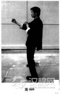 (5)右拳贴着右肋骨向内摩擦旋转,至心窝处停住,呈拳眼朝上、拳面朝前状;右拳拳腕离心窝约一拳的距离(图008)。