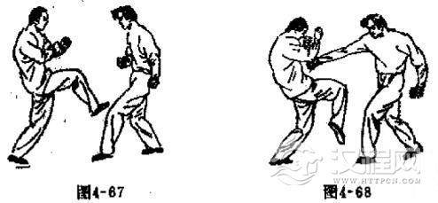 对方以右脚踢我裆部,当其右脚已出未到之际,我迅速抬左脚向自身左前方斜进一步,右脚紧随半步 ,使对方右脚落空,然后我以右手半步崩拳猛击其右脚或右肋部位(如图4-67, 4-68)。