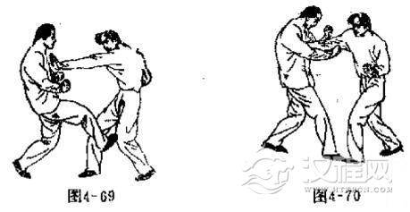 对方以右脚向我裆部踢来,当其右脚已出未到之际。我迅速抬右脚向自身右前方斜进一步,左脚紧随半步,同时以左掌扑拍对方左脚部位,使其右脚落空并身体受到震动,我顺势以右手半步崩拳向其左肋部猛击(如图4-69, 4-70)。