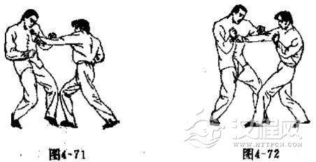 对方站立未动时,我先发制人,迅速接近对方,使右脚落予对方左侧,同时以左掌扑拍对方胸部,使其身体受到震动(如果对方抬左臂格挡,我亦可扑拍其左小臂或左大臂)。随后顺势以左脚向自身左前方进一步,同时以右手崩拳猛击对方胸腹部位(如图4-71、4-72)。