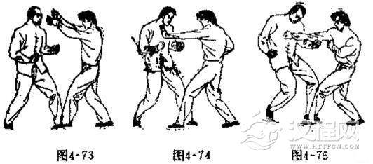 对方站立不动时,我先发制人,双掌迎面伸出,迅速接近对方,如果对方仍未动,我则以一掌扑拍对方身体,而以另一手变拳撇回,乘对方身体受到展动之机,以变拳之手做半步崩拳猛击对方胸腹部位(如图4-73, 4-74, 4-75)。