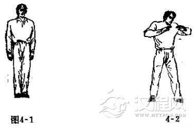 预备式:立正姿势站好,头要正直,项部上顶,脊椎要直并垂直于地面。两眼向前方平视或略向前上方坡视。两耳似听非听,面部似笑非笑。下颏微收,舌抵上颚。全身放松,无丝豪拘谨之处。呼吸自然,平心静气。默立片刻(如图4一1).