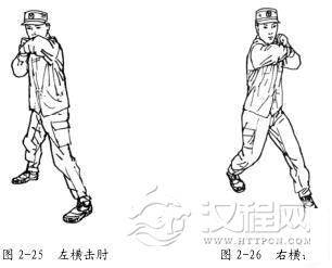 右横击肘的动作要领:在格斗势的基础上,身体稍向左转,随即身体向左转髋转体,右膝内扣,同时,右臂上抬与肩平,右肘弯曲约30°,挥肘向左摆击,着力点在肘部;左拳护于颌前,目视攻击方向(图 2-26) ;击出后,迅速将肘收回,成格斗势。
