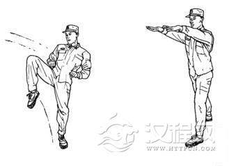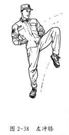 左冲膝的动作要领:在格斗势反势的基础上做动作,其他动作的要领同右冲膝。根据需要也可在格斗势的基础上完成(图 2-38) 。