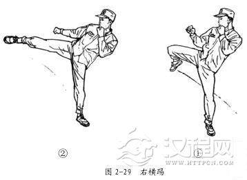 右横踢的动作要领:在格斗势的基础上,重心移至左脚,左腿支撑,微屈,左膝左脚外摆,身体向左转的同时,右腿展髋屈膝,大小腿夹角约 130°(图 2-29①) ,边侧抬边向左方弹击,脚背绷直,着力点在脚背或小腿胫部末端; 踢腿时, 支撑腿以前脚掌为轴跟随转动,脚跟斜向前。上体挺腰侧倾,左拳护于颌前,右拳自然下摆,目视攻击方向(图 2-29②) 。击出后,膝关节挺直的瞬间,迅速屈膝收腿落步,右脚后撤一步,成格斗势。