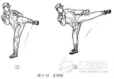 左侧踹的动作要领:在格斗势的基础上,右脚前垫步,重心移至右脚,右腿支撑,微屈,左腿展髋扣膝,勾脚尖,大小腿略成 90°,脚掌正对攻击目标(图 2-30①) ,上体侧后仰,左脚展髋伸膝向前方直线踹出,腿充分伸直,着力点在脚跟;踹腿时,支撑腿以前脚掌为轴跟随转动,脚跟斜向前。上体挺腰侧倾,右拳护于颌前,左拳自然下摆,目视攻击方向(图 2-30②) 。击出后,膝关节挺直的瞬间,迅速屈膝收腿落步,成格斗势。