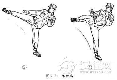 右侧踹的动作要领:在格斗势的基础上,重心前移,左腿支撑,微屈,右腿展髋扣膝,勾脚尖,大小腿略成 90°,脚掌正对攻击目标(图 2-31①) ,上体侧后仰,右脚展髋伸膝向前方直线踹出,腿充分伸直,着力点在脚跟;踹腿时,支撑腿以前脚掌为轴跟随转动,脚跟斜向前。上体挺腰侧倾,左拳护于颌前,右拳自然下摆,目视攻击方向(图 2-31②) 。击出后,膝关节挺直的瞬间,迅速屈膝收腿落步,右脚后撤一步,成格斗势。