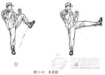 左前蹬的动作要领:在格斗势的基础上,右脚前垫步,重心移至右脚, 右腿支撑, 微屈, 上体微后仰, 左腿提膝上抬, 勾脚尖 (图 2-32①) ,脚向前上方直线蹬击,着力点在脚跟。蹬击时,上体保持格斗势,目视攻击方向(图 2-32②) 。击出后,迅速收腿落步,成格斗势。