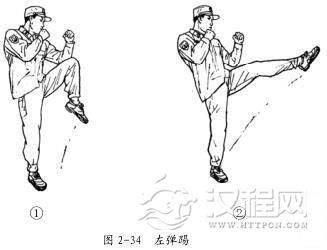 左弹踢的动作要领:在格斗势的基础上,右脚前垫步,重心移至右脚, 右腿支撑, 微屈, 上体微后仰, 左腿提膝上抬, 压脚尖 (图 2-34①) 。随即以大腿带动小腿向前上方纵向弹击,脚背绷直,着力点在脚背。踢击时,上体保持格斗势,目视攻击方向(图 2-34②) 。击出后,迅速收腿落步,成格斗势。