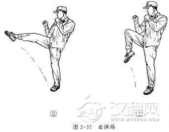 右弹踢的动作要领:在格斗势的基础上,重心前移,左腿支撑,微屈,身体稍向左转的同时,右腿提膝上抬,压脚尖(图 2-35①) 。随即以大腿带动小腿向前上方纵向弹击,脚背绷直,着力点在脚背。踢击时,上体保持格斗势反势,目视攻击方向(图 2-35②) 。击出后,迅速收腿落步,右脚后撤一步,成格斗势。