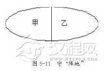 动作要领: 一个圆圈分成两半, 甲乙两人各占一半, 背手站立 (图5-11) 。一方为进攻,另一方防守,相互肢体不接触,防守方通过步法移动阻挡进攻方进入我方“阵地” ,尔后交换练习。