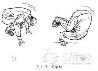 动作要领:在立正姿势的基础上,屈膝下蹲,两手撑地(图 2-75①) ;弯腰勾头,以背部着地,用两脚蹬力向前滚翻,随即双手抱膝(图 2-75②) ,迅速起立。