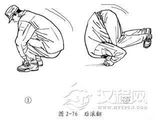动作要领:在立正姿势的基础上,屈膝下蹲弯腰勾头(图 2-76①) ,借身体后仰和两手撑力,按臀部,背部着地的顺序向后滚翻(图2-76②) ,随即迅速起立。