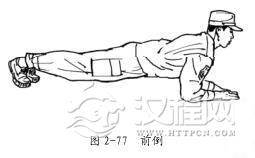 动作要领: 在立正姿势的基础上, 身体自然前倒, 同时两臂屈肘,置于胸前,掌心向下,腿挺直,抬头,收腹,两手主动拍地,以两掌及小臂着地(图 2-77) 。