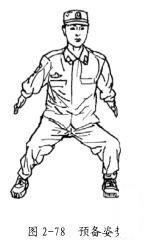 倒功预备姿势的动作要领:在立正姿势的基础上,左脚向左跨出一步(约与肩宽) ,屈膝半蹲,两臂后摆,五指并拢,掌心相对,上体微向前倾,目视正前方(图 2-78) 。