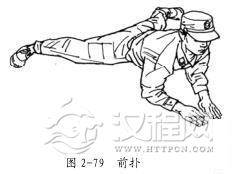 前扑的动作要领:在倒功预备姿势的基础上,两脚蹬地,向前跃出,同时两臂前摆,掌心向下,迅速屈臂,主动拍地,以两掌、小臂及两脚内侧着地,两脚分开比肩宽(图 2-79) 。