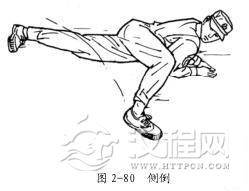 动作要领:在倒功预备姿势的基础上,两臂迅速前摆,身体随即向左(右)后转身,右(左)腿向左(右)抡摆扣腿,以右(左)脚全脚掌、两手及小臂拍地,身体左(右)侧着地,右(左)腿在上,两腿弯曲成剪式, (图 2-80) 。