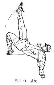 动作要领: 在倒功预备姿势的基础上, 两膝向前下顶, 上体后倒,两臂前摆并迅速向后挥臂,两手及小臂主动拍地。同时,挺腹勾头,踢右(左)腿,以手臂,背部上端和左(右)脚前脚掌着地,两臂与身体约成 90°(图 2-81) 。