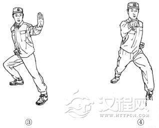 随即,左手成八字掌前挡,右拳收于腰际,拳心向下(图 2-62③) ;重心前移成左弓步的同时,右拳向前击出与肩同高,左拳收于腰际,拳心向上,目视前方(图 2-62④) 。