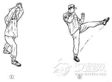 动作用途:架防护头,弹踢敌裆,掌砍敌颈。
