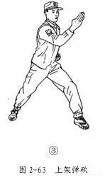 动作要领:右脚上步成右弓步的同时,双臂上架,左臂在外(图2-63①) ;起左脚弹踢(图 2-63②) ;左脚落步成左弓步的同时,右手变掌向前砍击与颈部同高,左拳收于腰际,拳心向上,目视前方(图2-63③) 。