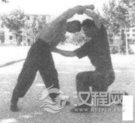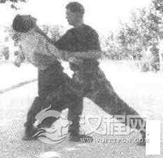 实用技法:我上右脚成右弓步,从敌背后突然以左拳猛击后腰,其必失衡后抑。我乘势右臂前伸,动作不停,我左手速抓握右手腕,同时右肩顶压敌头部,形成合力使敌窒息。