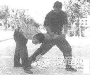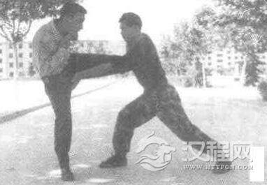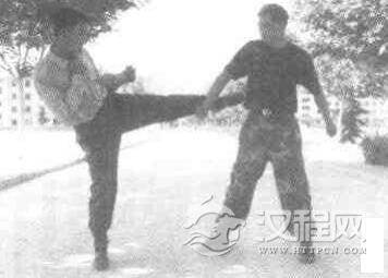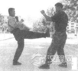 实用技法:敌我双方对峙,敌用左脚向我腹部踢击或蹬击,我左闪身,同时右手向外楼开敌来腿,动作不停,我左拳变掌由下向上猛撩敌裆部。