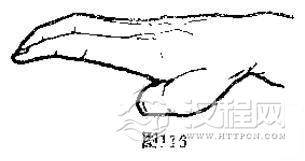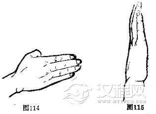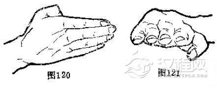 贯手的手形与手刀基本相同,要求将拇指完全向掌内密合。最好将其佘四指控成同样长度(只要微弯中指即可),见(图120图121)。