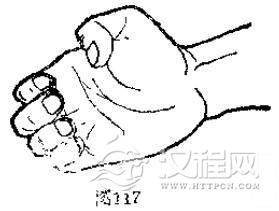 将全指的第二关节全部弯屈扣紧,拇指的第二关节可稍放开些,尤如熊掌,见(图117)。主要用第三关节前的各指面扒击对方。