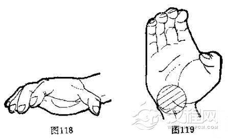 开始和手刀相似,然后把手腕稍微伸向手背(后仰),即可用手掌底部攻击,见(图119)。另外还可用拇指和食指之间的部位击打对方的脖子(图118)。