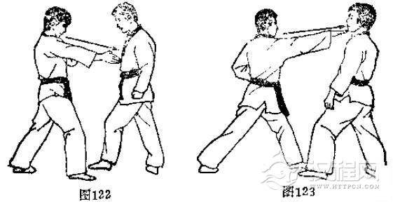贯手的念思就是戳击,因此将四个手指控成一样长度,在戳击对方时,手指就不易挫伤,贯手的使用部位主要是中指前端,使用方法可参见(图122和图123)。