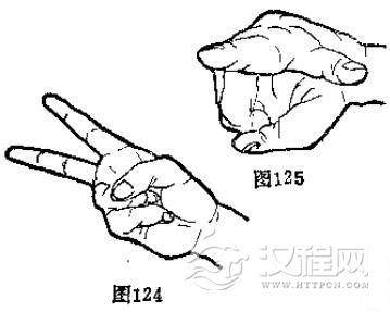 二本贯手的手形见(图124、图125),二本即二指之意,因此主要使用食指和中指的前端戳刺对方。此动类似我国武术中的“二龙戏珠”。