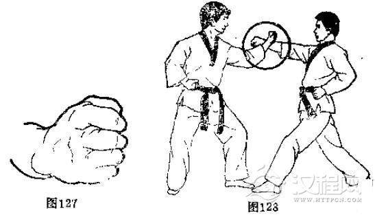 跆拳道的手首是作为防御动作时使用的,其使用部位是手的内外四面均可,见(图127),甚至也可用到手腕或手臂,其作用就是格挡(图128)。