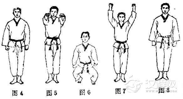 见(图4-图8)的动作,注意两臂后伸上举都要尽量加大幅度,两膝下蹲要求全蹲。