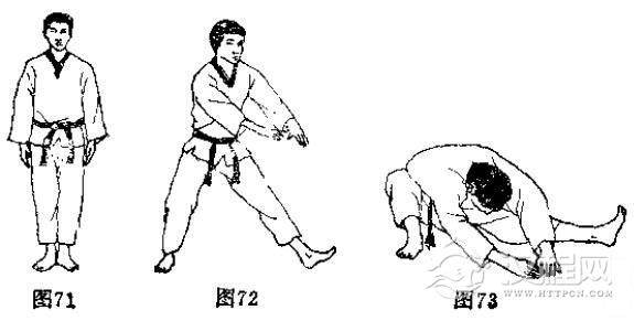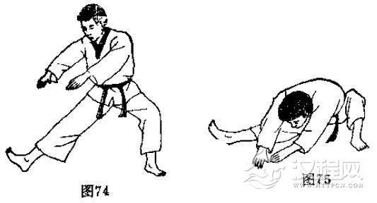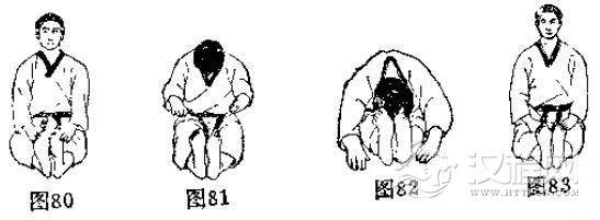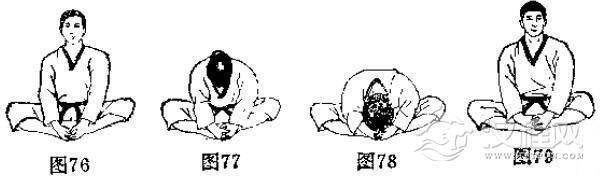 见(图76-图79)的动作,注意两足底必须相对井拢,上体尽量前俯。